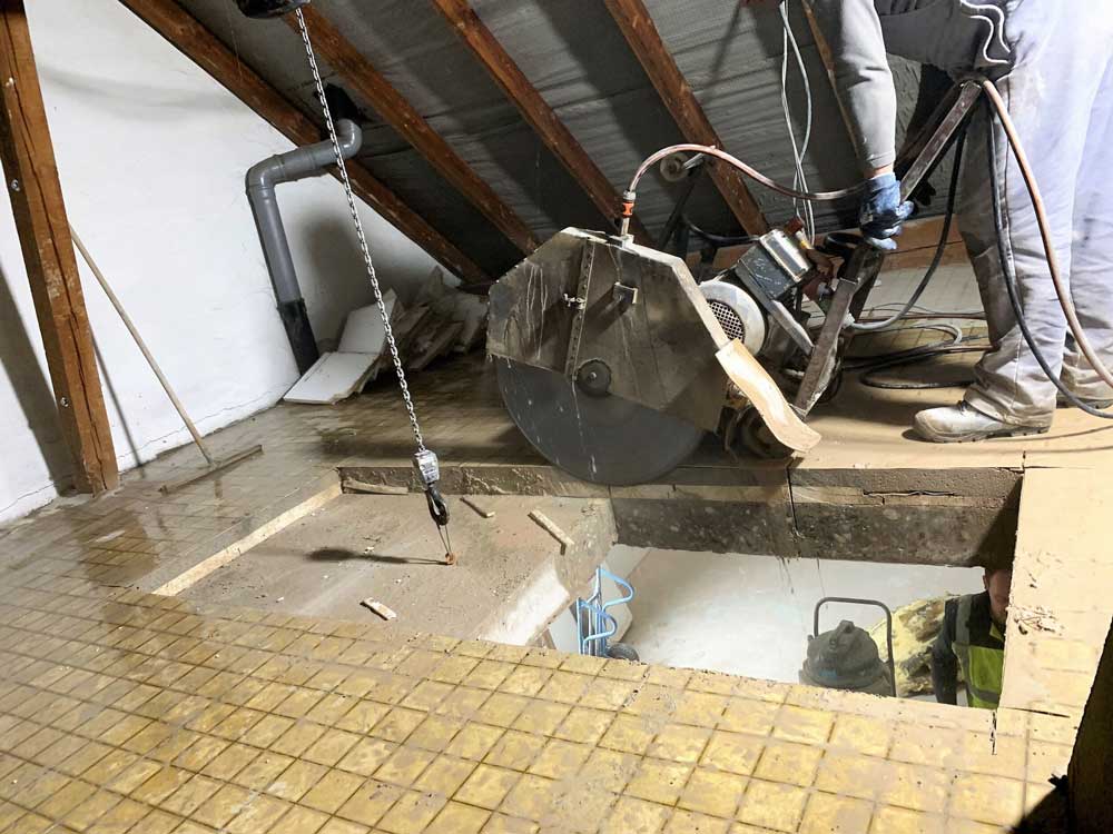 Unser Team hat sich auf die Herstellung von Deckenöffnungen spezialisiert. Für einen solchen Deckendurchbruch verwenden die Mitarbeiter eine moderne Bodensäge. Mit dieser können wir Schnitttiefen von bis zu 90 cm realisieren. Entsprechende Öffnungen schneiden wir in Decken und Böden aus Beton. Darüber hinaus eignet sich unsere Bodensäge zum Entfernen alter Fundamente.